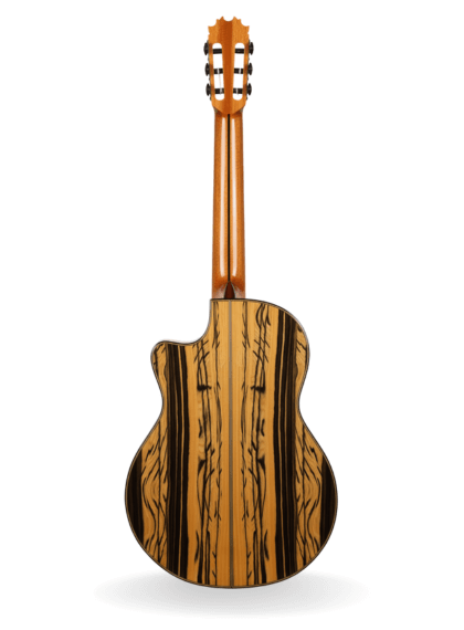La tapa maciza de pino abeto es la clave para un sonido claro, preciso y con gran respuesta, mientras que maderas como el ébano o el cedro, etc. permiten que cada rasgueo y cada golpe cobren vida con una riqueza tímbrica ideal para la interpretación flamenca. Este sonido tan particular, va de la mano de un diseño con vida propia tal y como veremos a continuación.