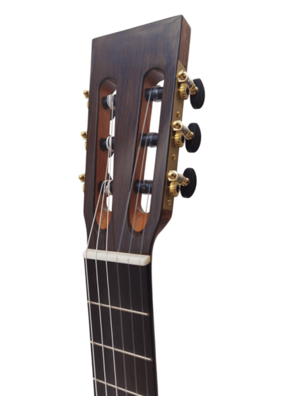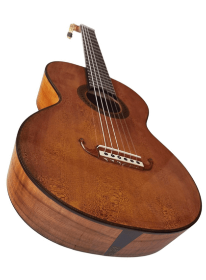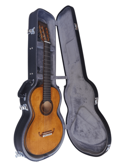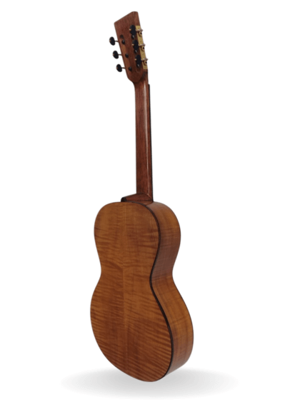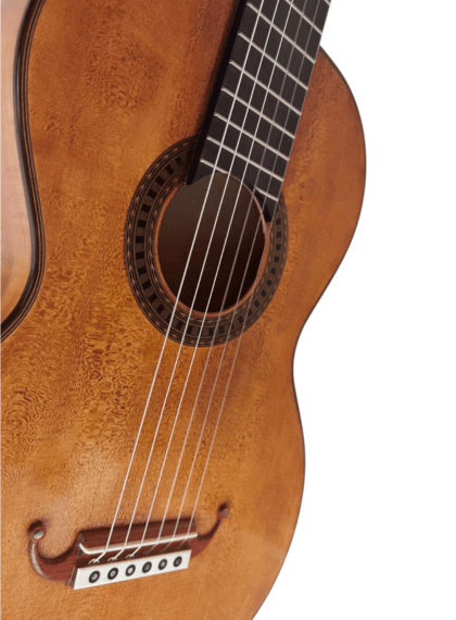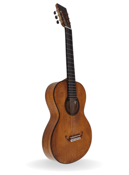 Se han escogido unas maderas que permiten replicar el aspecto y sonido de la guitarra romántica del siglo XIX. Su tapa es de pino abeto macizo y los aros/fondo de arce rizado macizo.