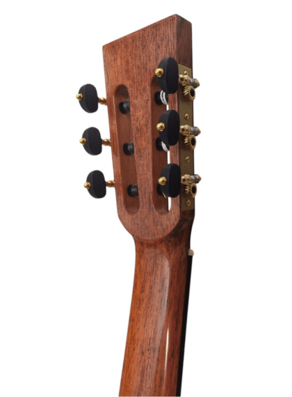 Posee todos los detalles que requiere este tipo de guitarra: el puente con diseño de época, una roseta sencilla y un clavijero de estilo antiguo en color negro.