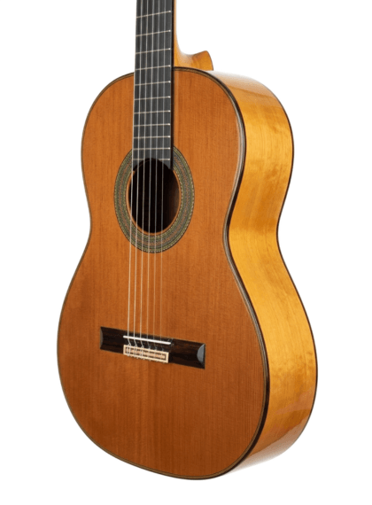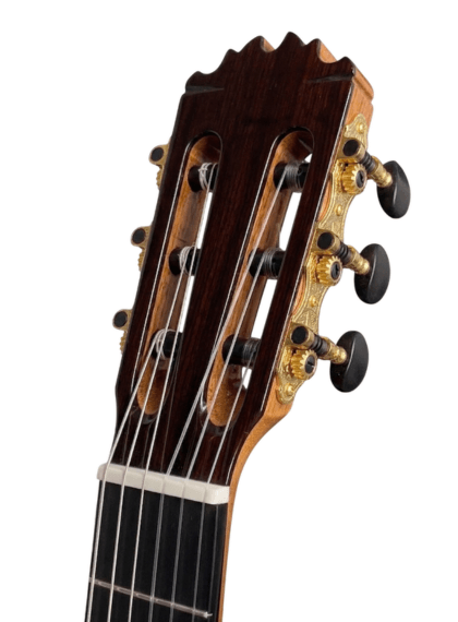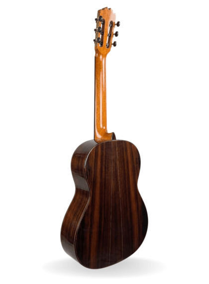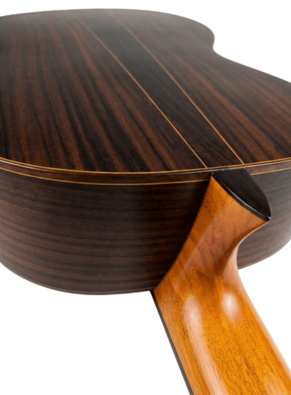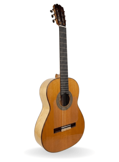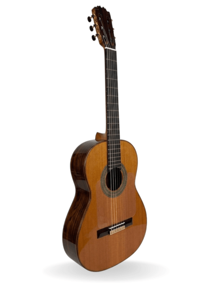 Este modelo destaca por el protagonismo que tienen sus maderas. Para la tapa armónica, el luthier ha empleado cedro macizo, mientras que los aros/fondo puede ser de palosanto o ciprés macizo.