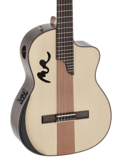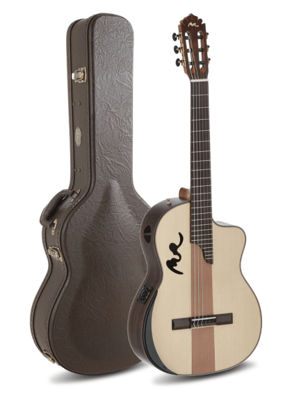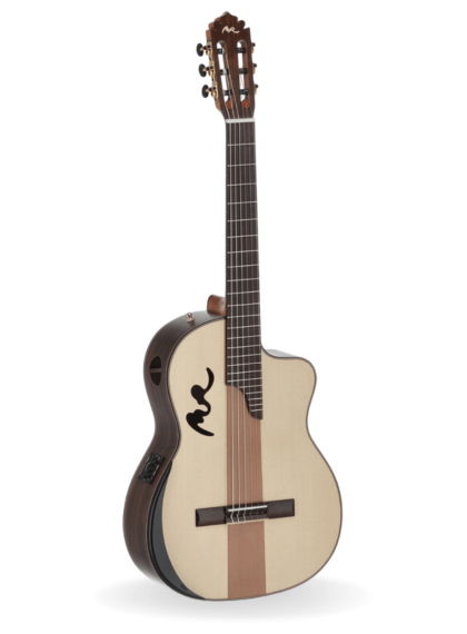 Esta joya artesana destaca por su comodidad gracias su mástil ergonómico, diseño cutaway, tacón español y apoyabrazos GEWA. Su estética combina maderas nobles, ribetes artesanales y un elegante troquelado en la tapa con el símbolo de MR, junto con un portal de sonido lateral que mejora el sonido. Con acabado satinado y clavijero dorado, proyecta elegancia y tradición española.