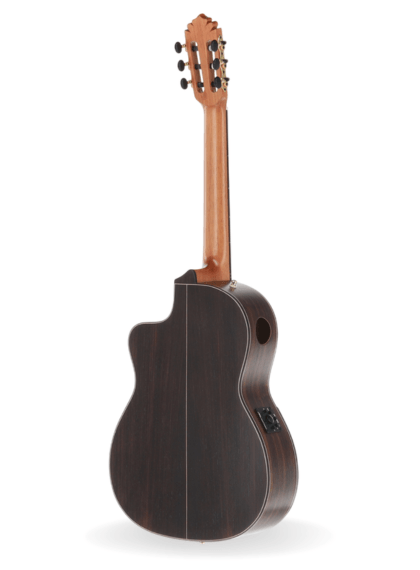 La Guitarra Manuel Rodríguez Café Cortado E Palosanto de India es un instrumento electroacústico de alto calibre que se fabrica en pino abeto y palosanto de India. Es una mezcla de precisión, calidad y experiencia que da como resultado un sonido de sabor complejo pero equilibrado.