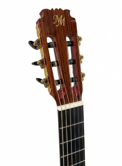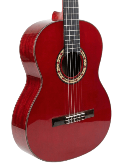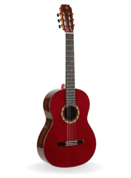 La Guitarra Modesto Malla Candela es una pieza maestra que combina una estética muy llamativa con una sonoridad excepcional. Posee unos acabados artesanales que destacan por su calidad y detalles: como su color rojo intenso, sus perfiles de palosanto y el original diseño de su roseta de rosas.
