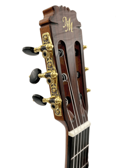 Es una guitarra fabricada con una delicadeza y buen gusto absoluto. Los perfiles presentan una marquetería exquisita a conjunto con la roseta, el mástil goza de gran suavidad, etc.