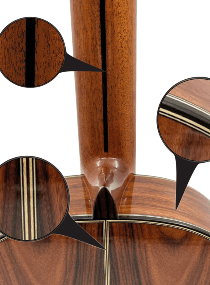 Una parte importante del éxito de esta guitarra se encuentra en la elección de las maderas que se ha llevado a cabo, eligiendo piezas seleccionadas que han sido sometidas a un tratamiento especial. El objetivo es que su acabado y su aspecto final sea el de una guitarra de la máxima clase y de un lujo superior.
